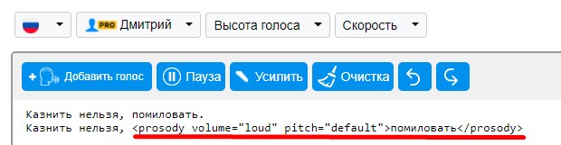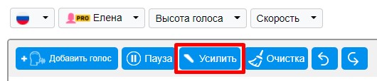 Для некоторых голосов можно сделать усиление на фразе или одном слове. Это дает возможность расставлять акценты в тексте. Но эта опция доступна не для всех роботов, а только для некоторых: Елена, Карина, Дмитрий, Анна, Борис, Катя, Денис.