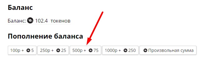 Когда вы потратите токены, их можно восполнить на странице тарифов или в профиле. Нажмите на одну из кнопок или выберите произвольную сумму.